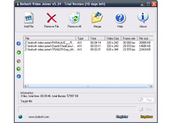 Con Boilsoft Video Joiner unire due o più video è difficile quanto selezionare due o più file. Cioè è semplicissimo. Si tratta di una utility dall'uso elementare: si scelgono i video da unire e si preme il tasto Merge. Tutto qui. Boilsoft Video Joiner è compatibile con tutti i principali formati tra cui AVI, MPEG, RM e WMV.